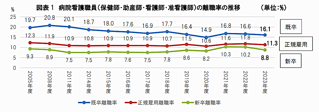 日本看護協会の調査(2023年度)では、正規雇用看護職員の離職率は11.3%でした。そのうち、新卒採用者の離職率は8.8%、既卒採用者の離職率は16.1%となっています。
