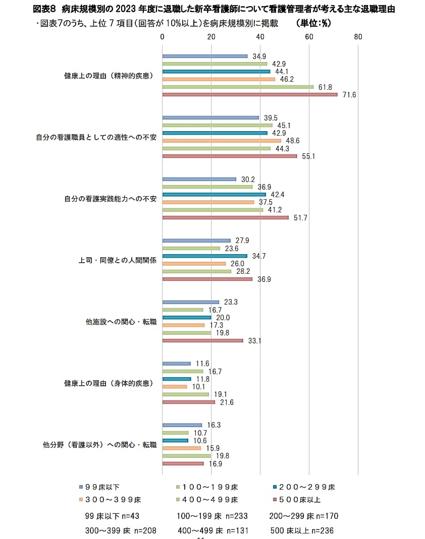 病床規模別では、2023年度の正規雇用看護職員の離職率は、99床以下12.6%、100~199床12.6%に対し、500床以上は10.4%でした。新卒採用者も99床以下・100~199床では12.1%で、500床以上は8.0%です。