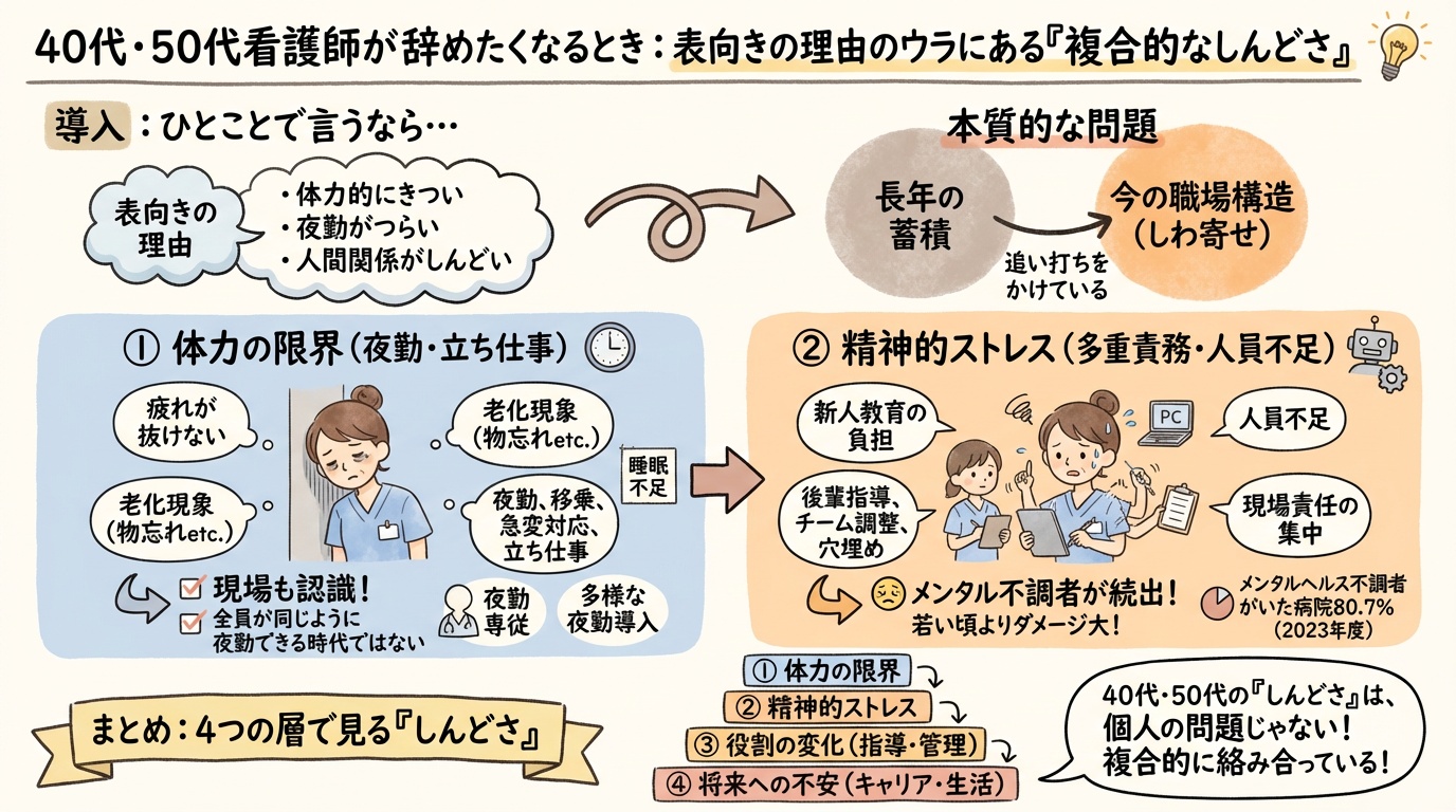 40代・50代看護師の離職を考えるときは、しんどさを次の4層で見ると整理しやすいです。
