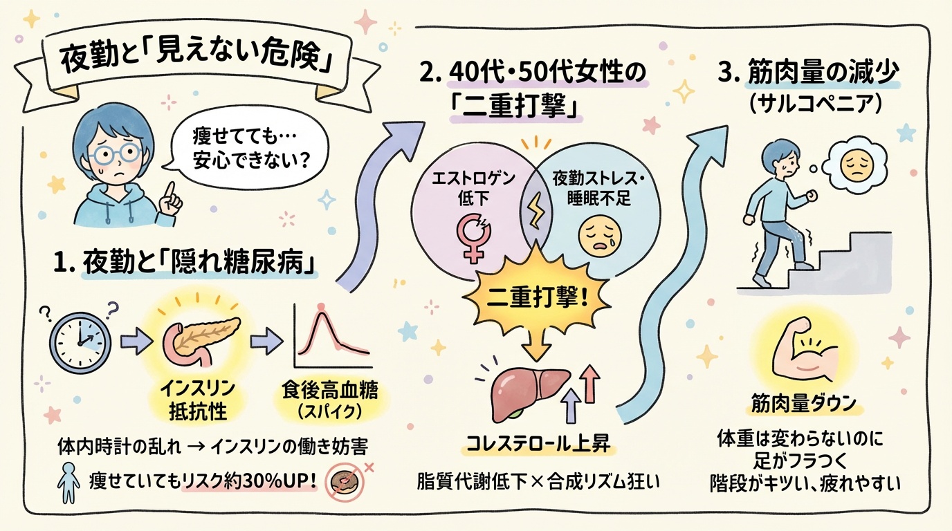 実は、夜勤が体に仕掛けるワナは「肥満」だけではありません。むしろ、見た目では気づきにくい「隠れリスク」の方が、40代・50代の体にとっては深刻なことがあるんです。