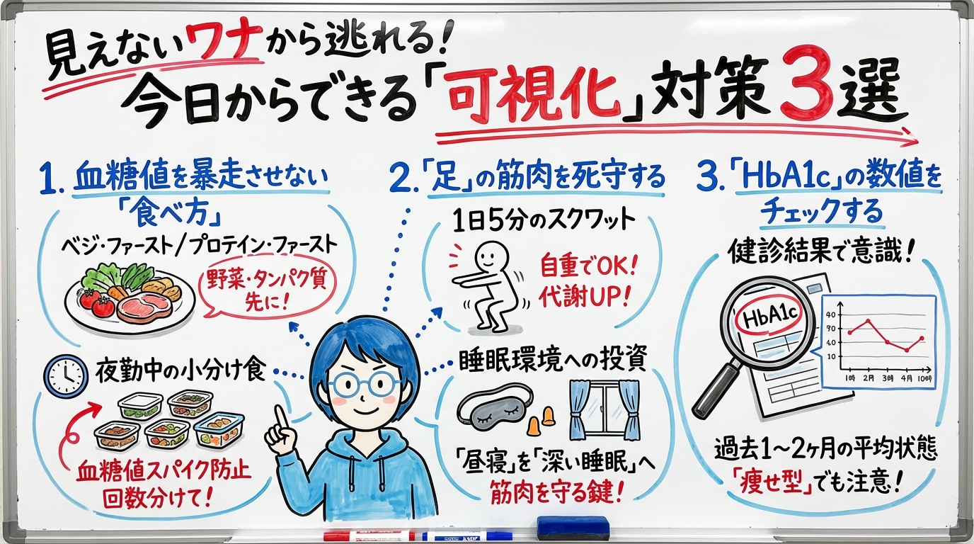 空腹時の数値が正常でも、食べた後に血糖値がドカンと跳ね上がる「血糖値スパイク」。不規則な食事タイミングと睡眠不足が重なる夜勤生活は、まさにこのスパイクの温床です。「痩せているから平気」という安心感が、一番の危険なんです。