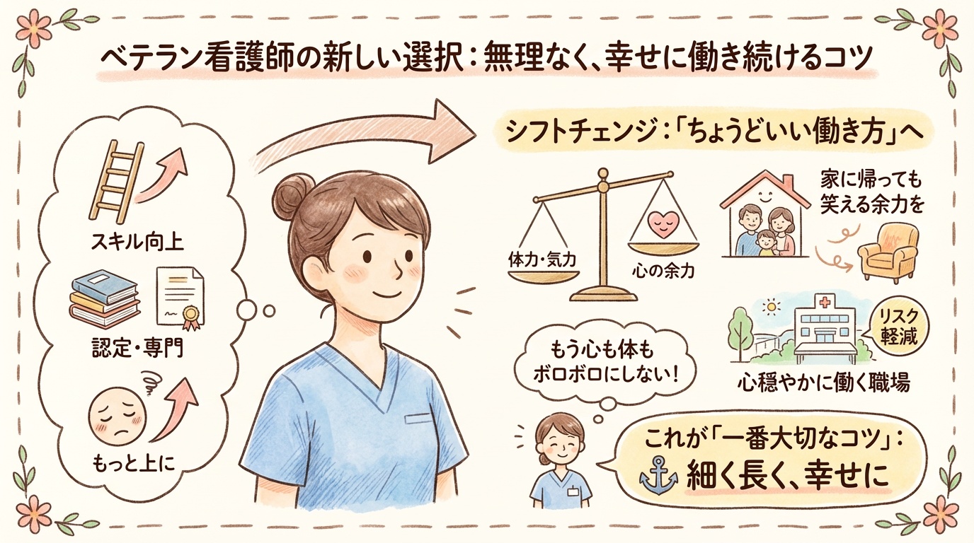 この記事では、同じように「これからの自分をどう守っていくか」に悩むあなたへ、ベテラン看護師が「自分を大切にできる働き方」に変えるための現実的な選択肢を、ぶっちゃけの本音でお伝えします。