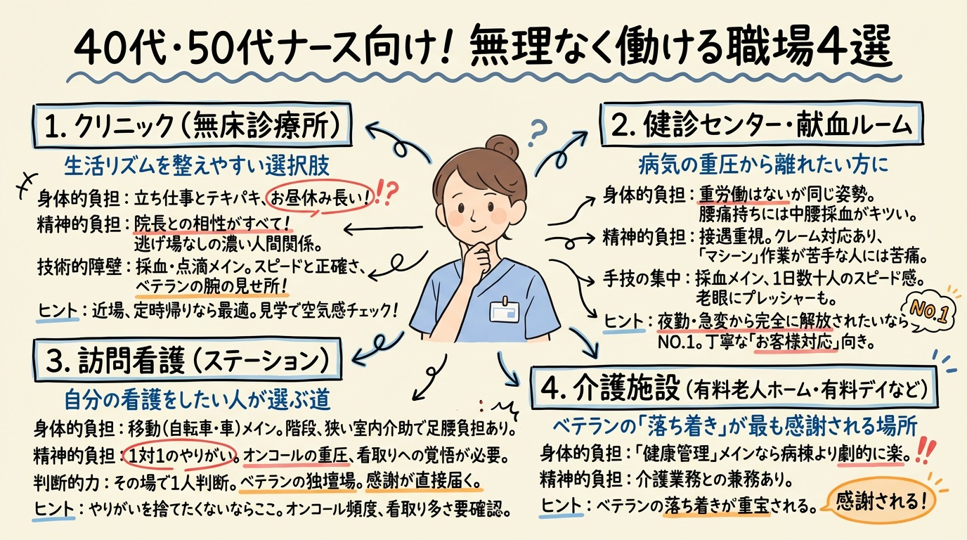 「病棟以外の世界なんて想像できない」という方のために、40代・50代が無理なく働ける代表的な職場を厳選しました。ベテランならではの「ここが良くて、ここがキツい」という視点で深掘りします。